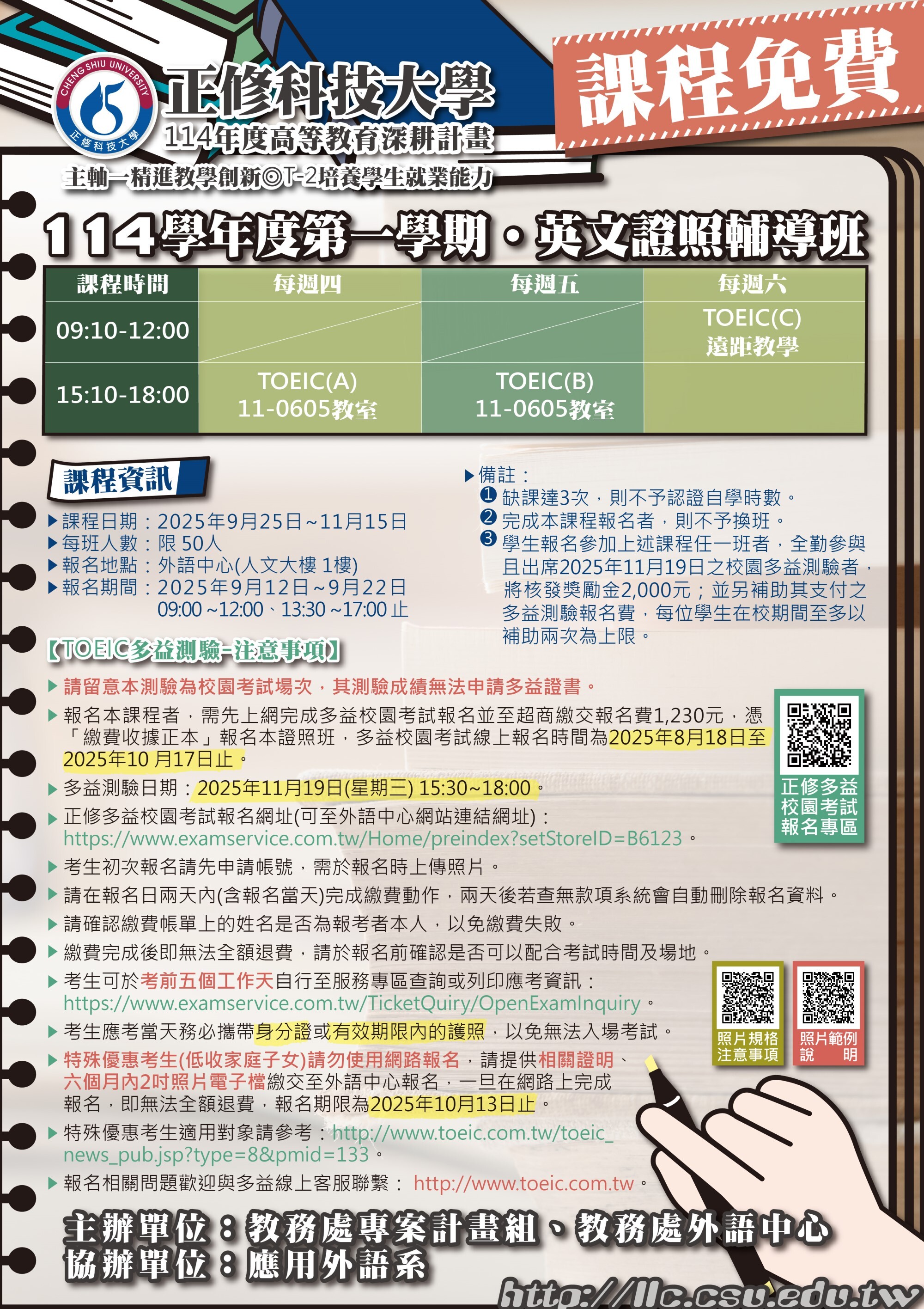 - 參加TOEIC證照輔導課全勤且無缺考測驗者,核發勵學金2,000元並補助多益測驗費。